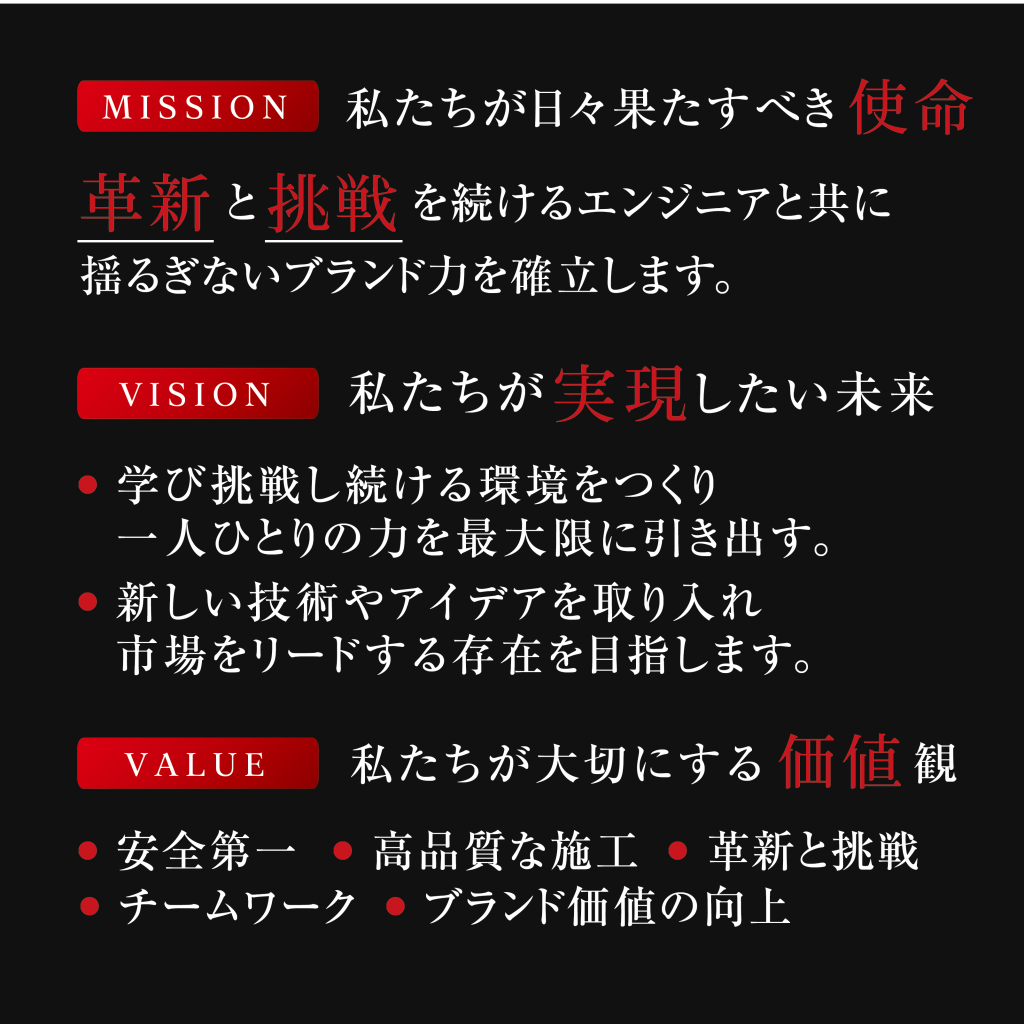 お客様の信頼に応える高品質な施工を提供し、地域社会の発展に貢献することを使命としています。確かな技術と豊富な経験を活かし、常に品質向上に努め、安全で持続可能な建築・インフラの提供を目指します。