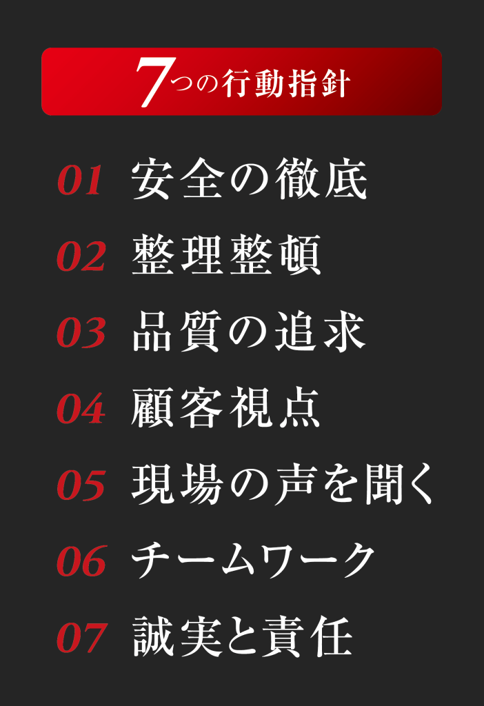 私たちは、プロフェッショナル集団としての誇りを持ち、安全と品質を追求し、絶え間ない確信と挑戦を通じて、お客様に感動と信頼を提供することで、揺るぎないブランドを築きます。